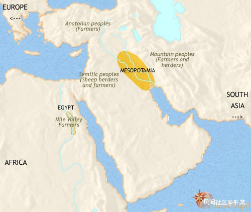 美索不達米亞平原是人類最古老的文化搖籃,灌溉農業為其文化發展的主要基礎。6000年前(公元前4000年)已有發達的兩河流域文明,曾出現蘇美爾、阿卡德、巴比倫、亞述等文明。