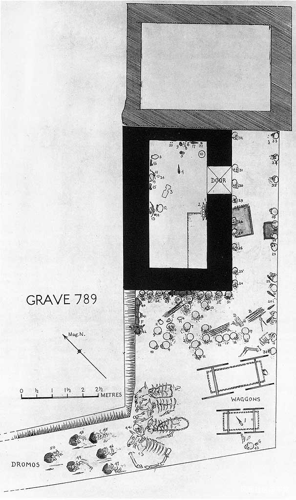 烏爾16個皇家陵墓中的15個。755沒有顯示,因為它被部分埋在779下面。這些墓室最初是在烏爾的城牆外,大約兩千年(公元前600年)後被尼布甲尼撒一世時期的城市的大城牆蓋住了。