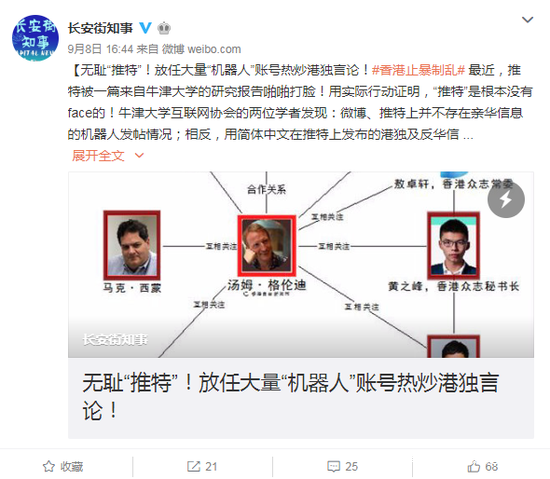 之前,“推特”以推送假新聞為由,直接關停了936個發表愛國挺港、譴責暴力言論的賬號,現在卻默許放任“機器人”賬號不停推送轉發港獨言論,用於掌握輿論話語權。由此可見,“推特”已淪為港獨分子與西方反華勢力勾連的一座橋樑!