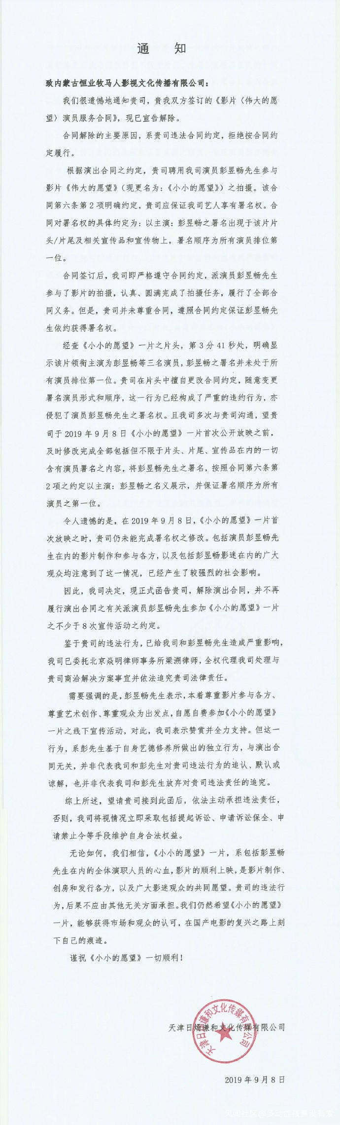 通知中提到,彭昱暢方面曾與片方多次溝通,希望片方在9月8日《小小的願望》首次點映前,對彭昱暢署名順序問題進行修改。但恆業未能完成,故彭昱暢方面宣告解約,也不再履行演出合同中彭昱暢配合宣傳合同的約定。
