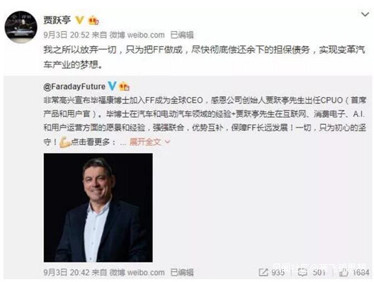 FF(法拉第未來)又出了刷屏大新聞:賈躍亭宣佈要讓位放權啦!