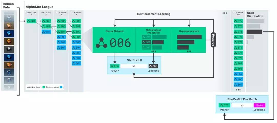 AlphaStar 聯盟。最初是通過人類玩家的遊戲回放視頻進行訓練,然後與其他對手對抗訓練。每次迭代就匹配新的對手,凍結原來的對手,匹配對手的概率和超參數決定了每個智能體採用的的學習目標函數,保留多樣性的同時增加難度。智能體的參數通過強化學習進行更新。最終的智能體採樣自聯盟的納什分佈(沒有更換)。