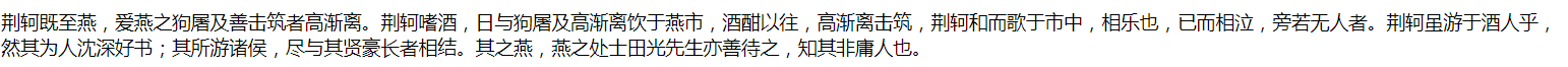 《史記·刺客列傳》中記載:“荊軻既至燕,愛燕之狗屠及善擊築者高漸離。荊軻嗜酒,日與狗屠及高漸離飲於燕市,酒酣以往,高漸離擊築,荊軻和而歌於市中,相樂也,已而相泣,旁若無人者。”