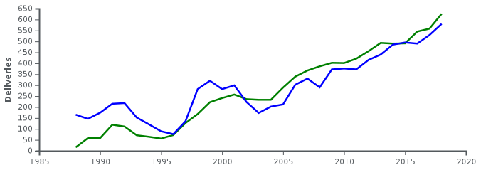 A320(綠)的銷售量很快趕上波音737(藍),並後來居上
