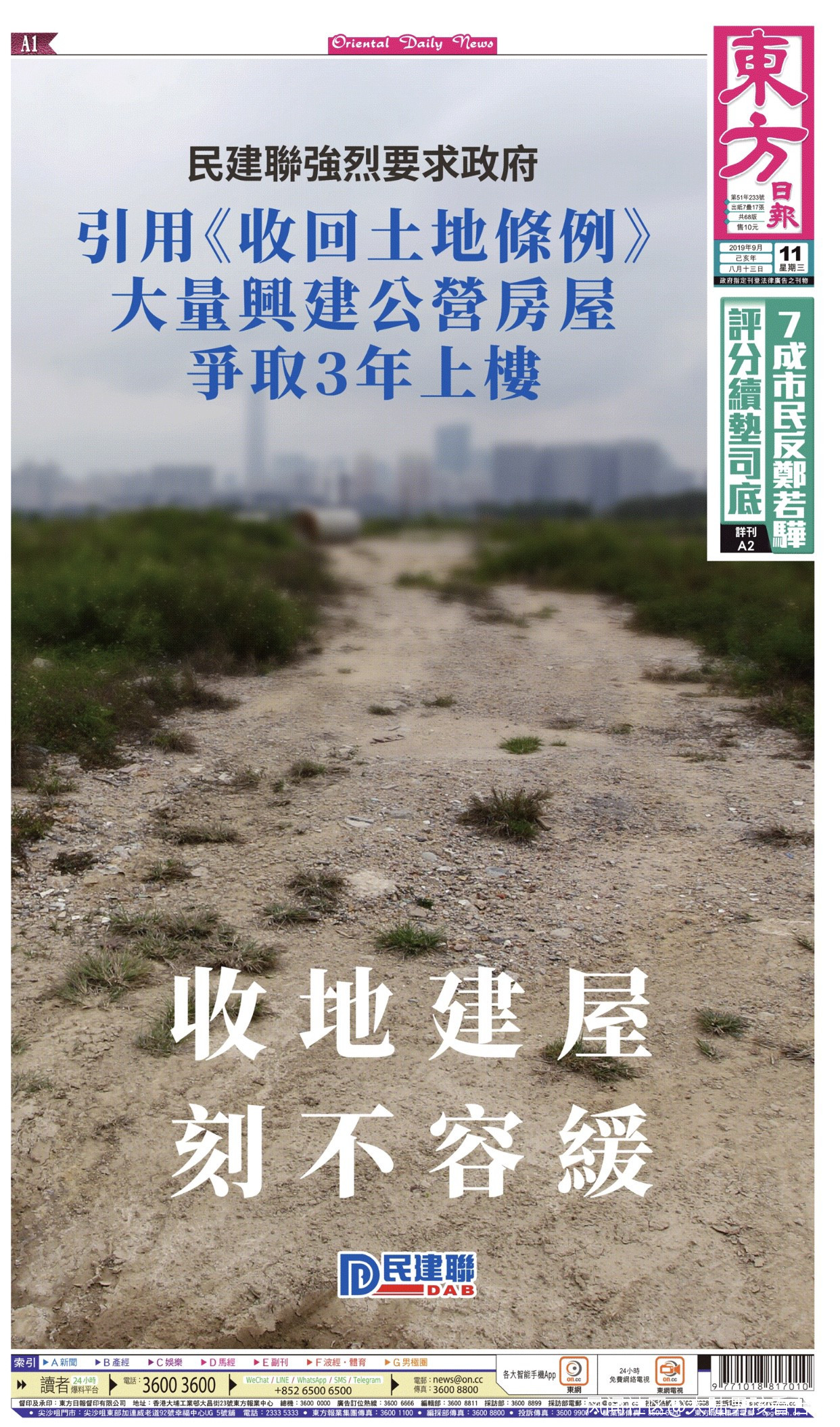 對此,11日上午,民建聯在東方日報等主流報紙上刊登文宣,要求特區政府引用《收回土地條例》大量興建公營房屋,爭取在3年可以交屋獲得成效。