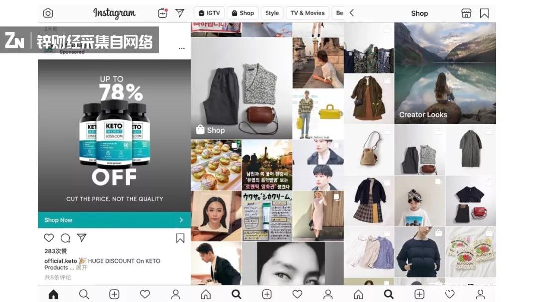 從用户的視角去看,ins當前在做的可變現行為,一個是關注頁裏插入商家投放廣告,另一個是信息流推薦頁面中可以外鏈電商平台的shop欄。