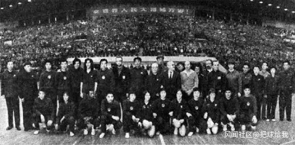 中、美乒乓球運動員友誼比賽結束後,丁西林和有關方面負責人陪同斯廷霍文團長走下主席台,和兩國運動員合影。新華社記者攝(刊發於《人民日報》1971年4月14日第6版)