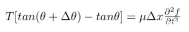 這樣,我們就把牛頓第二定律F=ma的三要素都湊齊了:F= T·sin(θ+Δθ)-T·sinθ,m=μ·Δx,a=∂²f/ ∂t²。把它們集合在一起就可以召喚神,阿不,就可以寫出AB的運動方程了: