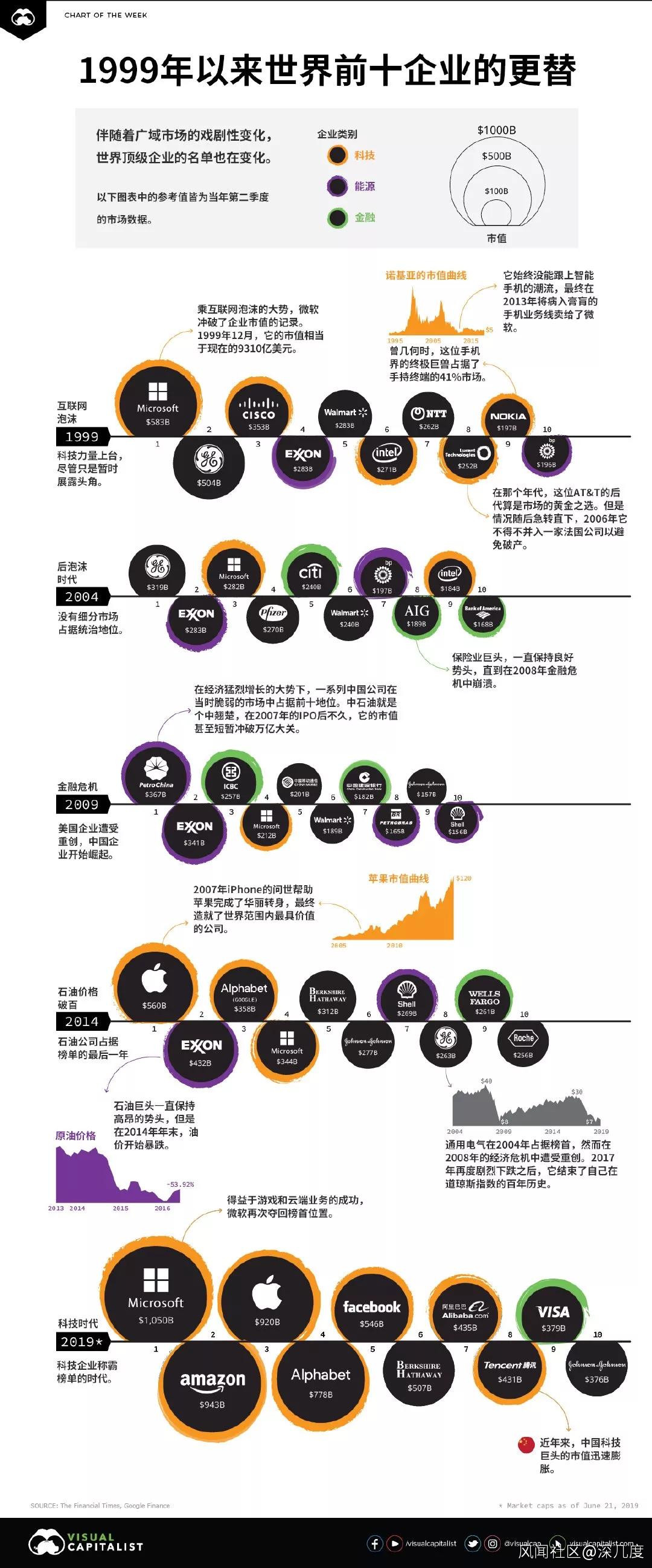 1999年互聯網泡沫爆發前後,市值最高的公司以科技公司為主;2004年後泡沫時代,互聯網、能源、金融幾大產業平分秋色;2009年金融海嘯來臨,能源企業佔據了半壁江山;2014年石油價格暴跌,能源企業逐漸銷聲匿跡,以蘋果為代表的科技公司拿回了主導權;2019年科技公司重新稱霸榜單,阿里、騰訊為代表的中國科技公司也躋身前十席位。