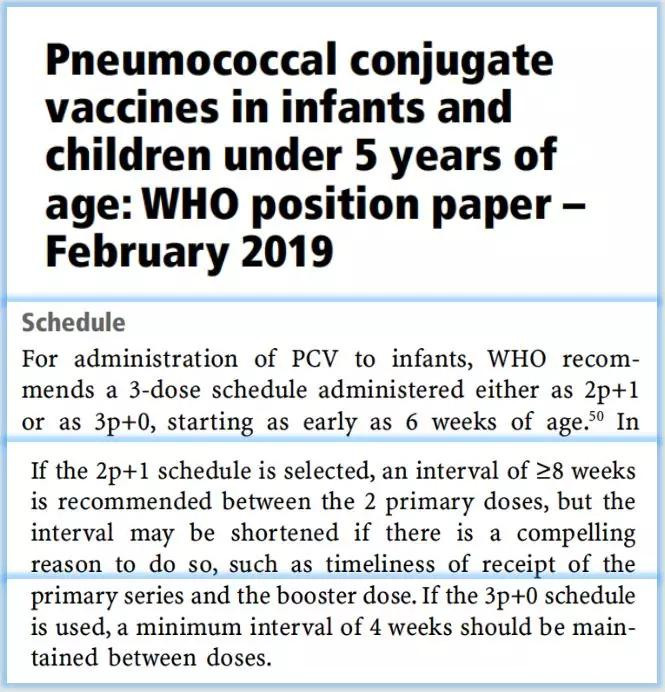 然而,在最新的2019版5歲以下嬰幼兒肺炎疫苗立場文件中,世界衞生組織明確推薦只接種3劑的 3+0或2+1程序,但沒有排斥3+1程序。
