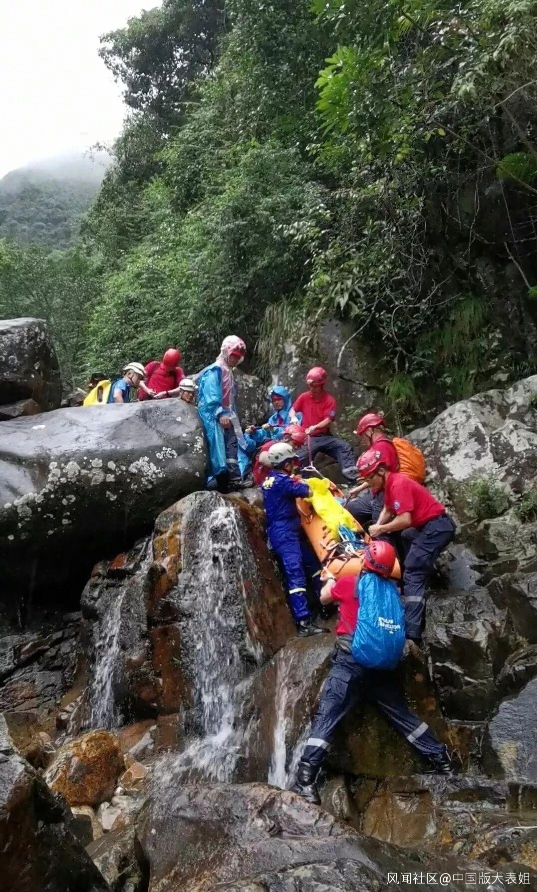 25日凌晨三點多,在深圳公益救援隊、惠州户外公益救援隊等民間救援力量和當地消防的協作下,傷員被轉移到卷式擔架上固定好。在兩條繩索的輔助下,擔架順着搭建好的通道,沿着崖壁一點點挪下山。