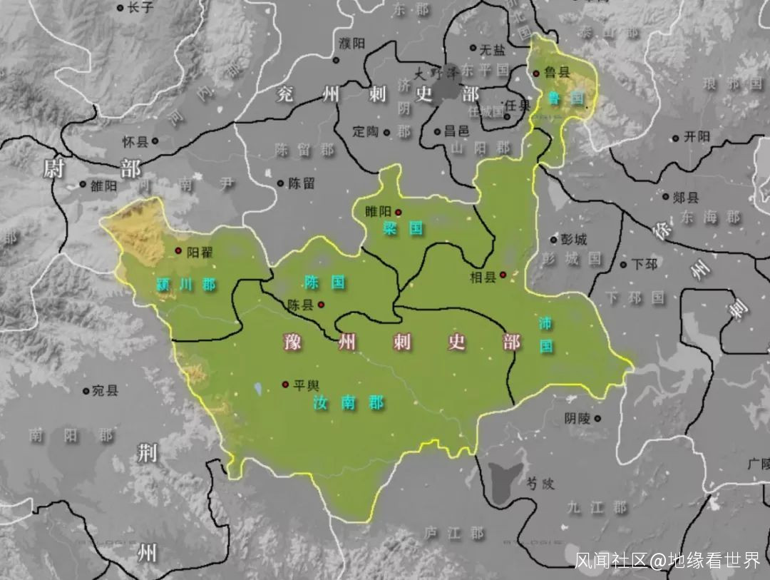 另一個能夠證明汝、潁二水地緣政治地位的,是它們的行政性質。在豫州所轄的6個郡級行政區中,只有潁川郡和汝南郡是郡,其餘的四個都是封國,包括:陳國、沛國、梁國以及魯國。秦統一天下之後,在行政上做出的最大改變便是以“郡縣制”取代“分封制”。