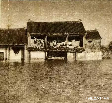 淮河中流的鎮陽關(蚌埠西)低矮的房屋被淹沒了,人們只得居住在較高的房子裏生活。圖片來源:人民畫報