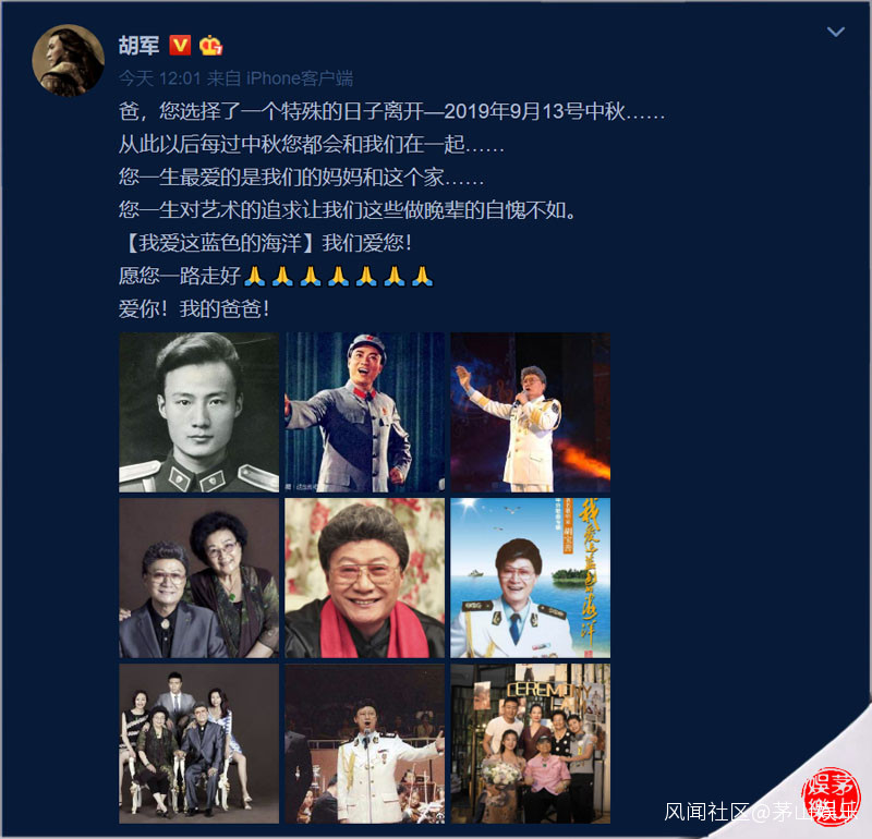 資料圖沒想到3天后的中秋節當天,著名歌唱家、國家一級演員胡寶善與世長辭,享年84歲。14日12:01分,兒子胡軍發文悼念父親,配文是:“爸,您選擇了一個特殊的日子離開—2019年9月13號中秋……從此以後每過中秋您都會和我們在一起……您一生最愛的是我們的媽媽和這個家……您一生對藝術的追求讓我們這些做晚輩的自愧不如。【我愛這藍色的海洋】我們愛您!願您一路走好!愛你!我的爸爸! ”