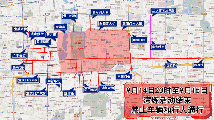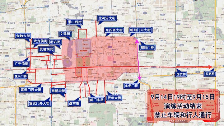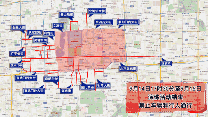 9月14日17時30分至9月15日演練活動結束,由府右街北口經府右街、北新華街至和平門路口向東,經前三門大街至崇文門路口,經北京站西、東街(不含西向東半幅路)至北京站東街東口(不含)向北,經東二環路(不含)至朝陽門橋(不含)向西,經朝陽門內大街(不含)、東四西大街(不含)、五四大街(不含)、景山前街、文津街至府右街北口以內區域;西長安街由府右街南口至復興門橋(不含);建國門外大街由建國門橋至國貿橋(不含);前門東路;前門步行街;煤市街;前門肯德基停車場;北海南門停車場;宣武門東、西大街;景山東街、西街、后街;北河沿大街;宣武門外大街;南新華街;香爐營頭條;草廠三條;西絨線衚衕;靈境衚衕;闢才衚衕;華遠街;大木倉衚衕;華遠北街;西單橫二條;太僕寺街;羅家衚衕;金融大街、廣寧伯街、武定侯街;祈年大街;東打磨廠街;鬧市口大街;西鐵匠衚衕;復興門南大街東側輔路,上述區域和道路除持有演練活動專用證件的車輛和人員外,禁止其他車輛和行人通行。