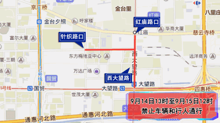 9月14日13時至9月15日12時,西大望路由紅廟路口(不含)至大望橋(不含),光華路由針織路口(不含)至光華路東口,除持有演練活動專用證件的車輛和人員外,禁止其他車輛和行人通行。