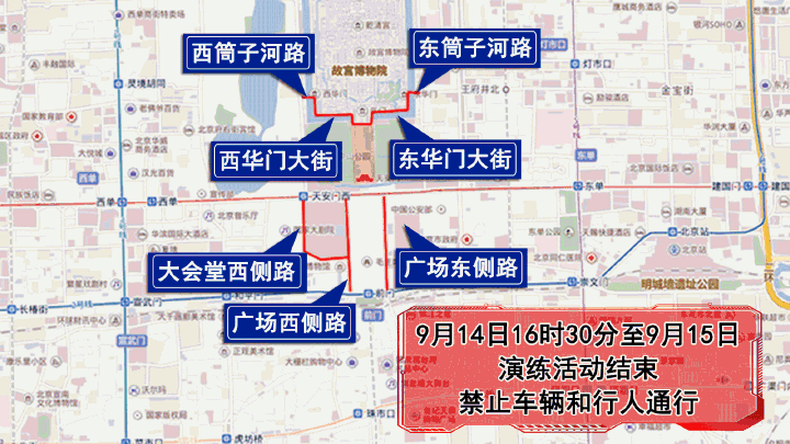 9月14日16時30分至9月15日演練活動結束,天安門前金水橋以北,故宮午門以南地區,西華門路口(不含)經西華門大街、西筒子河路、東筒子河路、東華門大街至東華門路口(不含),人民大會堂西側路,除持有演練活動專用證件的車輛和人員外,禁止其他車輛和行人通行。