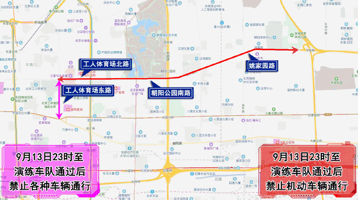 9月13日23時至演練車隊通過後,由東五環路平房橋經姚家園路、朝陽公園南路、農展館南路、工人體育場北路至工人體育場東路北口雙向主路,禁止機動車輛通行;由工人體育場東路北口經工人體育場東路至朝陽醫院大道口(不含)雙向主、輔路,禁止各種車輛通行。