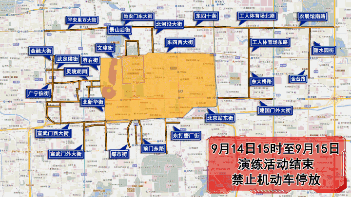 9月14日15時至9月15日演練活動結束,由府右街北口經府右街、北新華街至和平門路口向東,經前三門大街至崇文門路口,經北京站西、東街(不含西向東半幅路)至北京站東街東口(不含)向北,經東二環路(不含)至朝陽門橋(不含)向西,經朝陽門內大街(不含)、東四西大街(不含)、五四大街(不含)、景山前街、文津街至府右街北口以內區域;西長安街由府右街南口至復興門橋(不含);建國門外大街由建國門橋至國貿橋(不含);前門東路;前門步行街;煤市街;前門肯德基停車場;北海南門停車場;宣武門東、西大街;景山東街、西街、后街;北河沿大街;宣武門外大街;南新華街;香爐營頭條;草廠三條;西絨線衚衕;靈境衚衕;闢才衚衕;華遠街;大木倉衚衕;華遠北街;西單橫二條;太僕寺街;羅家衚衕;金融大街、廣寧伯街、武定侯街;祈年大街;東打磨廠街;鬧市口大街;西鐵匠衚衕;復興門南大街東側輔路;工人體育場北路、東路;東大橋路;平安里西大街;地安門西大街;地安門東大街;張自忠路;東四十條;農展館南路;朝陽公園南路;甜水園街;金台路,除持有演練活動專用證件的車輛外,禁止其他機動車停放。