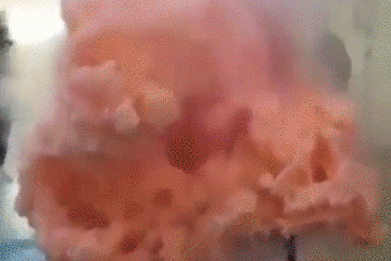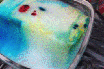 一切都準備就緒後實驗就可以開始了。在催化劑的作用下泡沫迅速膨脹,紅色與藍色的碰撞讓泡沫看上去很像西瓜汁……