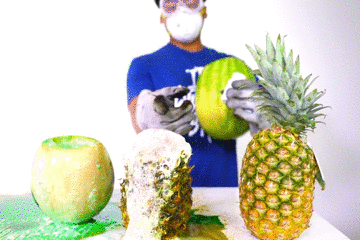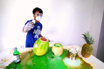 把溶液倒進水果裏噴射,效果挺不錯的,直接把小哥嚇出鏡頭了。