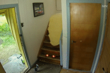 屋內一瞬間橙色泡沫從大桶中湧出,順着樓梯噴灑下來: