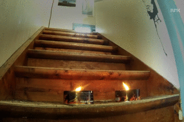與此同時大叔在樓梯底下襬放好蠟燭,等到泡沫順着樓梯四溢下來後,化學反應中釋放的氧氣和火苗一接觸,就會達到一個十分炸裂的效果。