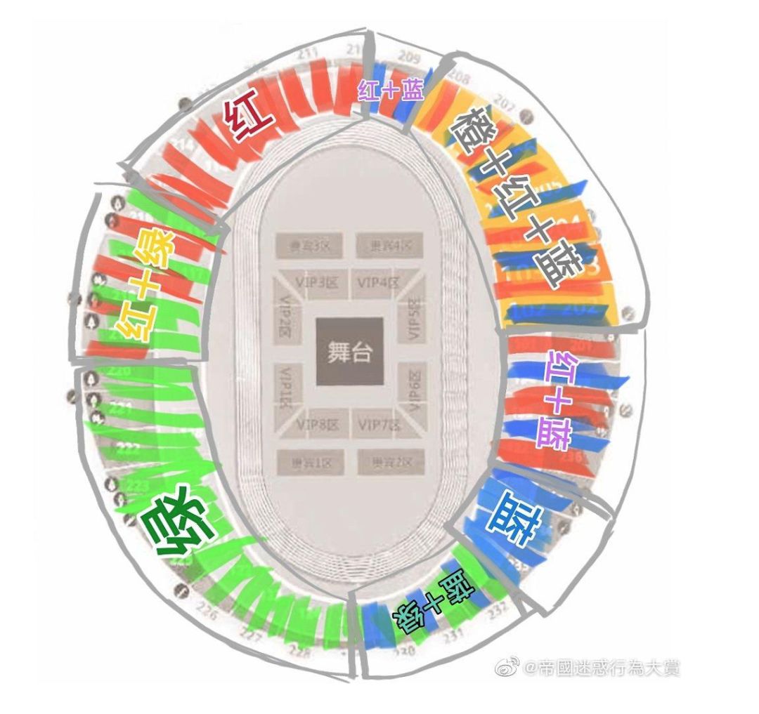 帝國盛會從六月得知演唱會信息到八月演唱會正式舉辦,正值暑假,TFBOYS的粉絲有充足的時間和精力準備/掰頭。雖然官方要到七月份才公佈,粉絲在六月份要麼從後援會大粉那裏,要麼從黃牛那裏得知今年演唱會的舉辦場地。知道場地後,各家會給體育場劃區,出“戰略規劃圖”,劃分成強攻區、主攻區、副攻區等等。強攻區,是搶票的時候最優先要搶的區域,以此類推。只有粉絲坐在一起,才能讓燈牌、應援物連成燈海。