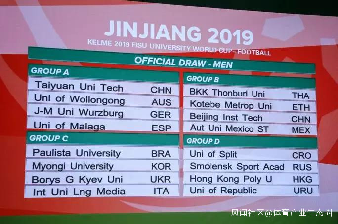根據抽籤結果顯示,男子組裏中國的太原理工大學被分入A組,同組的還有澳大利亞伍倫貢大學、德國維爾茨堡朱利葉斯·馬克西米利安大學和西班牙馬拉加大學。北京理工大學則分入了B組,將與泰國曼谷吞武裏大學、埃塞俄比亞科特貝都市大學和墨西哥自治大學對陣。香港理工大學所在的D組對手有克羅地亞斯普利特大學、俄羅斯斯摩稜斯克國立體育與旅遊學院和烏拉圭共和國大學。