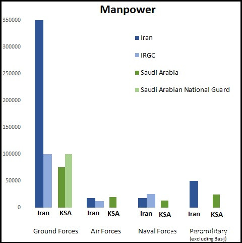就人力而言,沙特阿拉伯擁有傳統的地面,空中和海軍部隊。其準軍事邊防衞隊 - 大約10500人 - 在內政部的管轄下獨立運作。它還擁有4500人的海岸警衞隊,以及內政部下屬的9000人的設施安全部隊。沙特依靠其常規部隊及其與美國的夥伴關係來保護其利益。