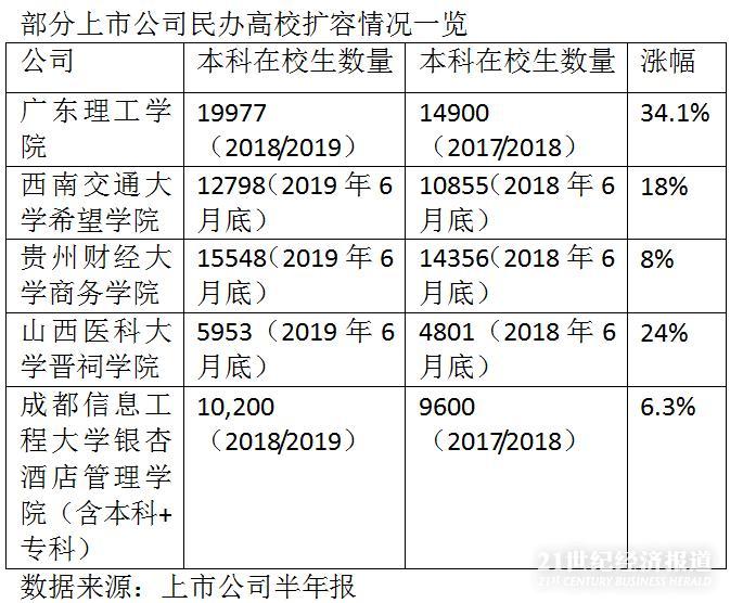不僅僅是廣東理工學院。21世紀經濟報道查詢上市公司半年報,顯示包括山西醫科大學晉祠學院、西南交通大學希望學院、貴州財經大學商務學院等多所院校本科生在校數量出現明顯提升。
