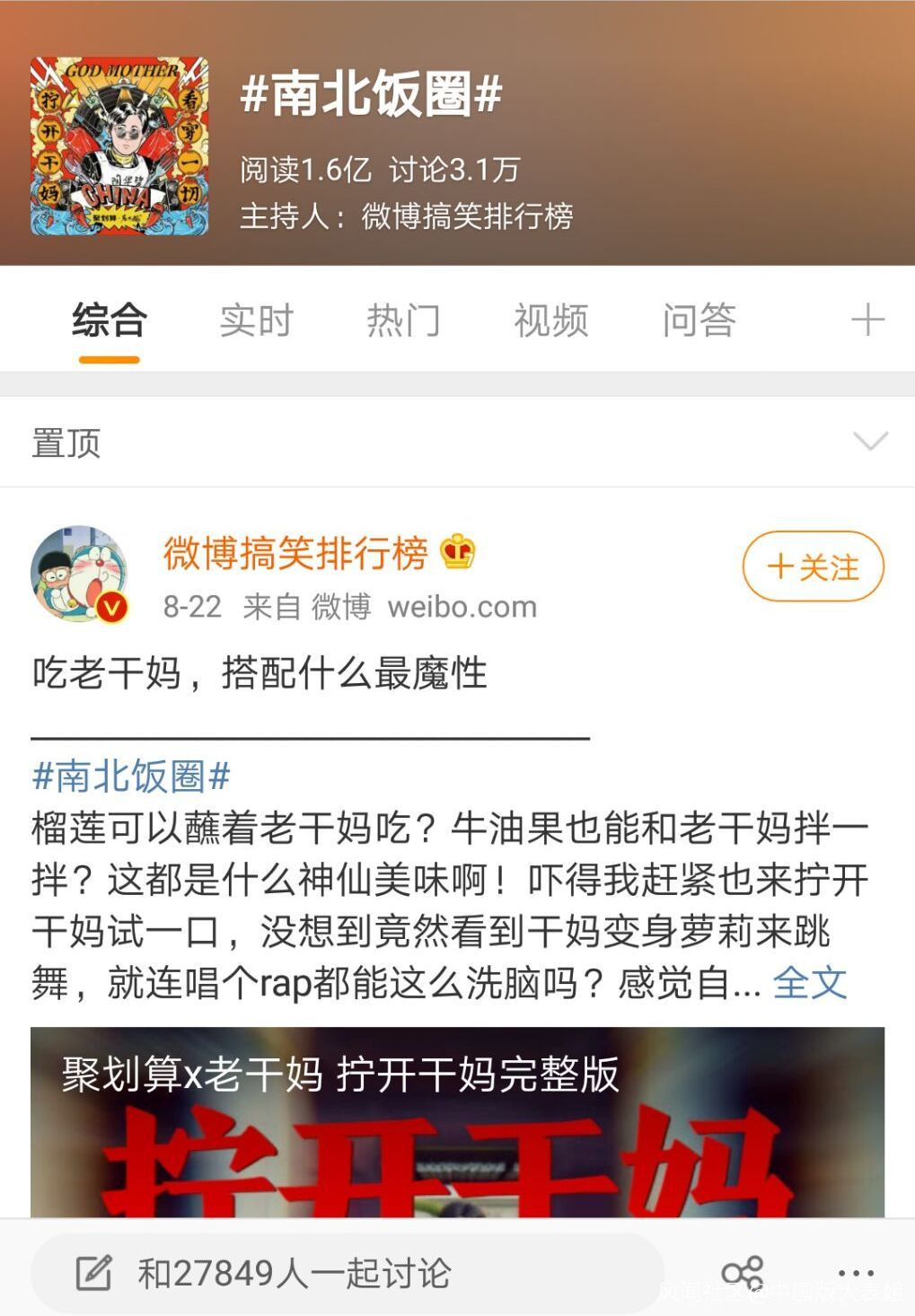不僅如此,微博上還推出了#老乾媽擰瓶舞#和#南北飯圈#兩個話題。#南北飯圈#話題中,老乾媽代表南隊發聲,與另一品牌PK。《每日經濟記者》注意到,僅#南北飯圈#這一話題,閲讀量已達1.6億。