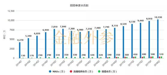 再看增速,從2014Q4到2016Q3,增值會員的數量幾乎徘徊在300萬上下,中間的幾個季度一度還出現了下滑或增長停滯的情況。隨後的2017Q3到2018Q1,增值會員數的增長速度也無非突出了一個慢字。