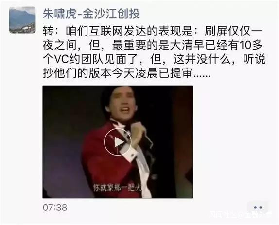 著名投資人朱嘯虎甚至次日清晨在朋友圈就表現出了相當的驚訝:“轉:咱們互聯網發達的表現是:刷屏僅僅在一夜之間,但,最重要的是,大清早已經有10多個VC約團隊見面了,但,這並沒什麼,聽説抄襲他們的版本今天凌晨已經提審……”