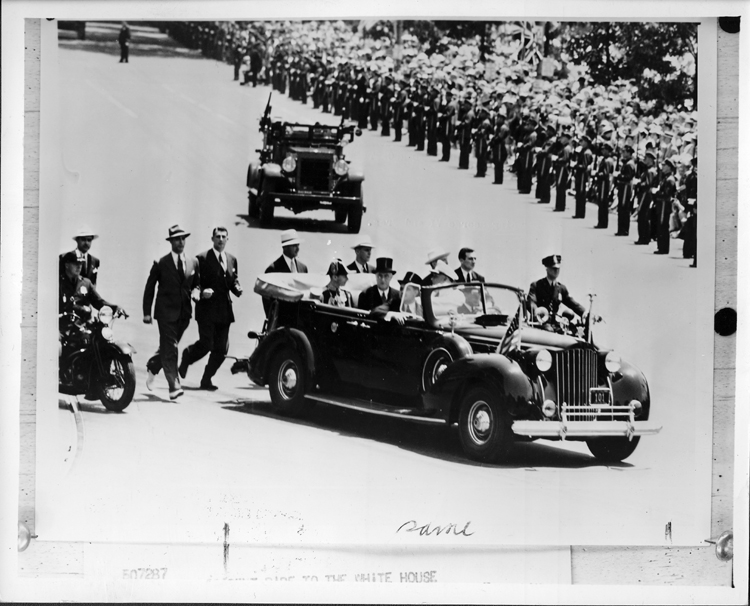 英國人愛擺譜,不過王室出訪的時候,倒不像美國總統那麼拿派,還是用東道主的禮賓車,這是喬治六世(就是電影《國王的演説》裏接替不愛江山愛美人的愛德華八世的那個,伊麗莎白二世的父親)在1939年訪問美國的時候,坐Packard Super Eight