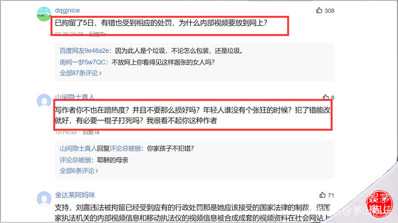 令人費解的同情聲還有這樣的“年輕人誰沒有個張狂的時候?犯了錯能改就好,有必要一棍子打死嗎?”,甚至還有人留言表示:“已拘留了5日,有錯也受到相應的處罰,為什麼內部視頻要放到網上?”大家看到沒,此人開始轉移視線了。開始質疑公佈監控視頻這件事,這是有人“故意”想引導公佈監控視頻這件事系違規行為,然後再把劉露塑造成受害者。