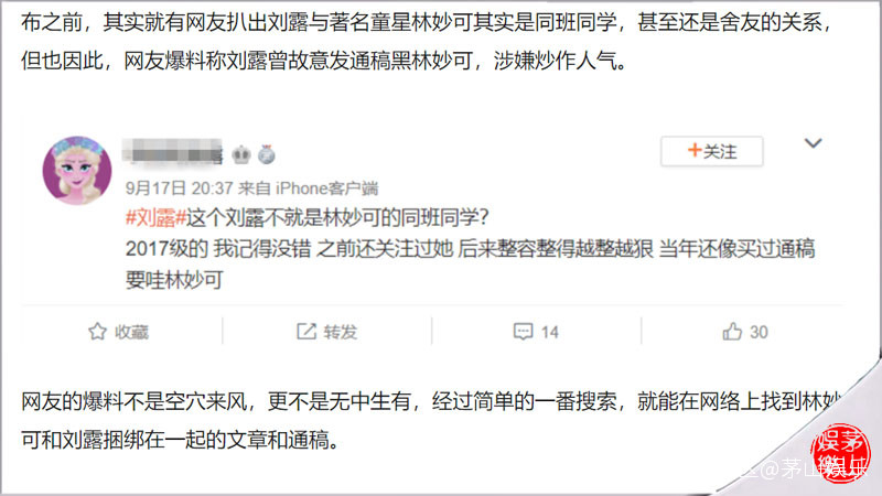現在沒有證據證明這些疑似水軍就是當事人劉露僱傭的,但是,此前有網友爆料劉露曾故意發通稿黑林妙可,涉嫌炒作人氣。或許有人不相信,但這還真不是空穴來風,更不是無中生有,大家都可以在網絡上找到林妙可和劉露捆綁在一起的文章和通稿。很多通稿的裏,相當多的主題都是借林妙可所謂的“長殘”來襯托劉露的“美麗”,如此明顯的拉踩通稿確實很無恥。