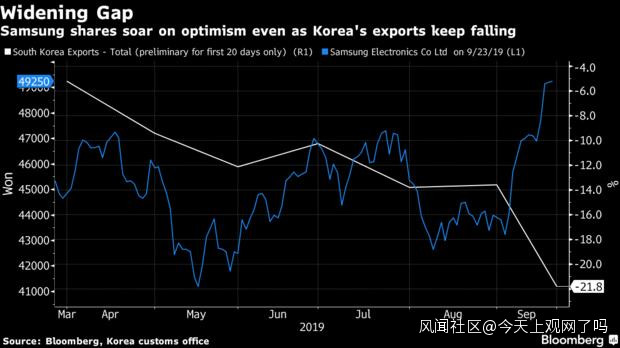 (儘管韓國出口持續下滑 但三星股價卻因樂觀情緒而飆升 來源:彭博)