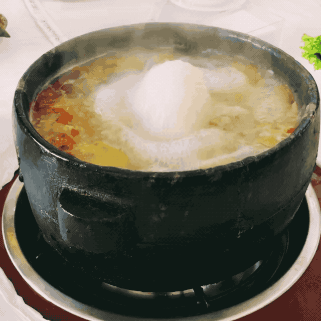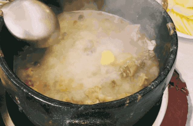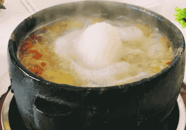 石鍋是美味的秘訣,這裏的石鍋是用一種叫“皂石”的雲母鑿出來的,能耐2000℃高温,傳熱快,在熬煮食物的過程中促進蛋白質肽鏈水解為氨基酸,含量增加的遊離氨基酸使得熬煮出來的雞肉鮮嫩、雞湯鮮美。