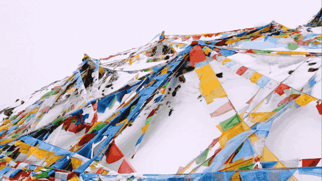 白色的山口經五彩經幡的裝飾讓人眼前一亮,更別提突如其來的風吹動經幡起舞,靈動萬分。還有間或出現的、撒向天空又飄向雪地的五彩紙片,那是或虔誠或好奇的人們在撒隆達。