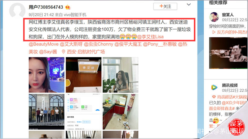 微博截圖不過,很快就有網友發現,這位與女演員李艾佳同名的網友原來只是個藝名。原來,早在20日,就有網友人肉出了網紅李艾佳的資料,可謂是非常的詳盡:包含了網紅博主叫什麼?哪裏人?名下有什麼公司?原來,網紅李艾佳的真名叫李璞玉,是陝西省商洛市商州區楊峪河鎮王澗村的,其名下有一家註冊資本為100萬人民幣的公司——“西安迷迪安文化指媒有限公司”。