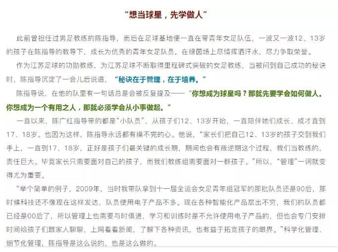 在一切調查結果未公佈之前,這一系列事件究竟真相如何尚未可知。不過略顯尷尬的是,江蘇省足協官網上的那篇1年前的專訪中,用了不少篇幅介紹陳指導是如何管理和培養這些小隊員的。陳廣紅也曾在專訪中提到:“育人”是培養隊員裏非常重要的一環。