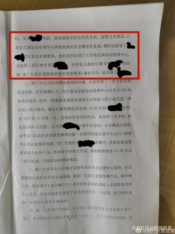這封舉報信是寫給江蘇省南京市紀檢委的。信中描述了江蘇省足球運動管理中心05-06年齡段的女足主教練陳廣紅及助理教練凌雨陽在從2018年至今的任職期間存在的種種問題,其中包括“誘騙讓隊員打上主力,以威脅、恐嚇,引誘球員脱光全身衣服”以及“對一些犯了小錯誤的隊員罰款,而且數額巨大”等讓人震驚的內容。