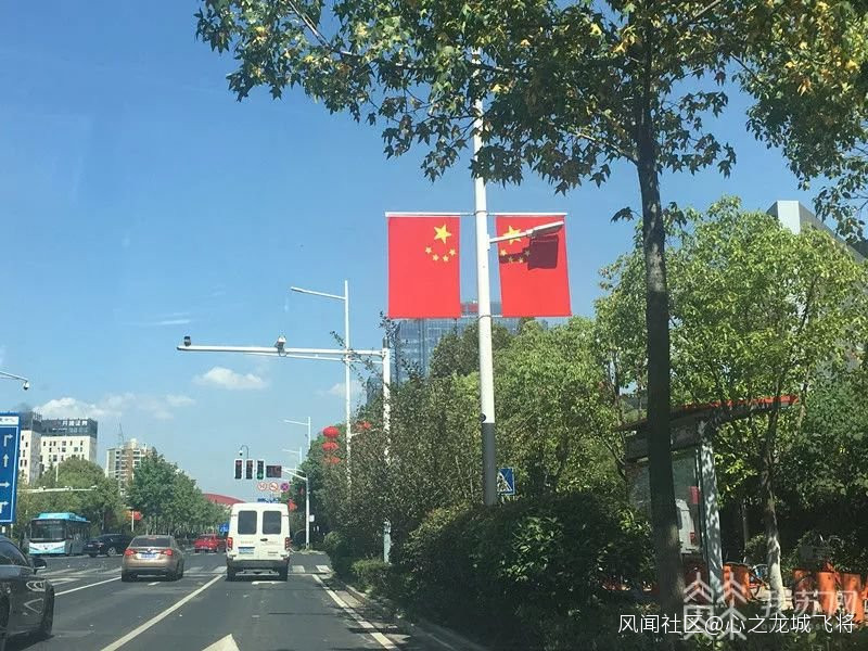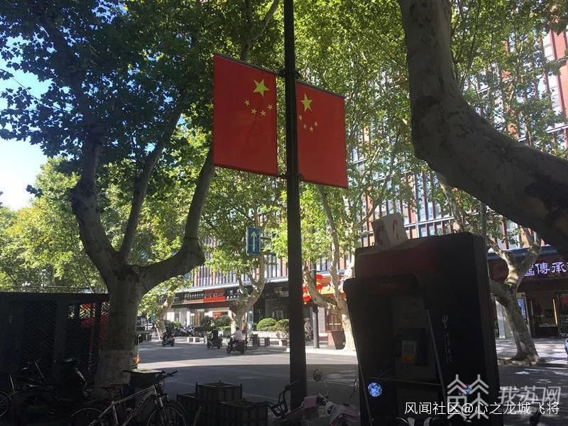 現在在南京的主城區,部分商家和小區外都已經懸掛上了嶄新的國旗。懸掛形式也多樣,有的是用旗杆豎直懸掛,有的則是固定在旗座上呈45度角上揚。