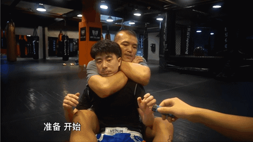 視頻顯示,一人偽裝成歹徒,用手鎖住民警的咽喉。在演示前,民警就介紹,這種鎖喉的方式名為“三角鎖”,是自由搏擊中比較狠的一個招式,一旦被束縛住很難掙脱。