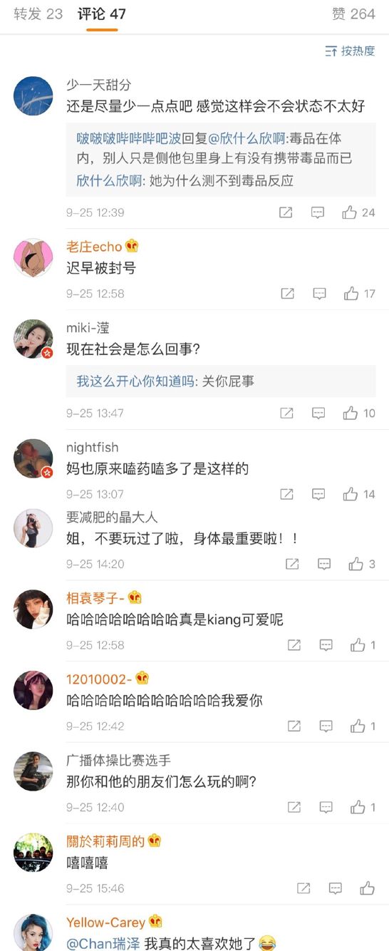 不僅如此,她還公開叫囂“我喜歡吸毒怎麼樣”、“我吸都跑到遠遠的地方吸”、“鼻孔都白白的啦,想抓嗎?不好意思這不是台灣”。