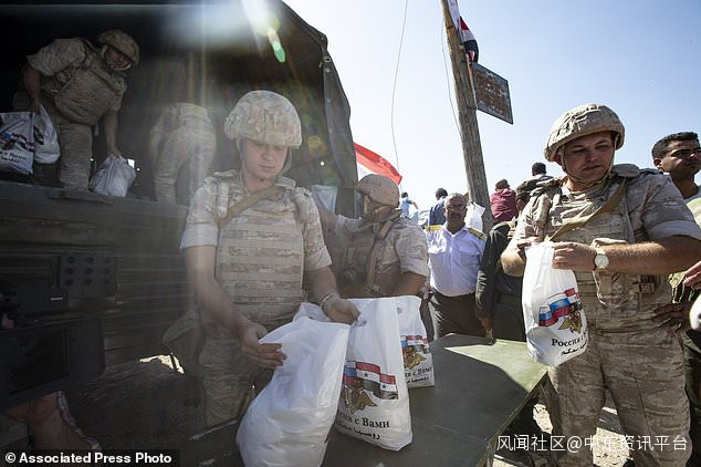 2019年9月25日,星期三,俄羅斯士兵向敍利亞城鎮汗謝洪(Khan Sheikhoun)的居民分發食品和其他補給品。該鎮在敍利亞西北部伊德利卜省(Idlib)處於戰略要地,敍利亞軍隊在俄羅斯軍方的大力支持下發動了大規模的進攻,前不久敍利亞政府軍收復此地。