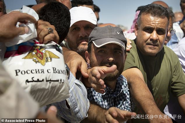 2019年9月25日星期三,敍利亞城鎮汗·謝赫洪(Khan Sheikhoun)的當地居民於在領取糧食和其他物資。該鎮在敍利亞西北部伊德利卜省(Idlib)具有戰略地位,在經歷數週的大規模屠殺後於,前不久敍利亞軍隊在俄羅斯軍事支持下發動進攻,收復此地。袋子上的文字是“俄羅斯和你在一起!”