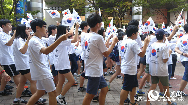 光復節當天,手持國旗上街遊行的韓國學生 夏雪攝