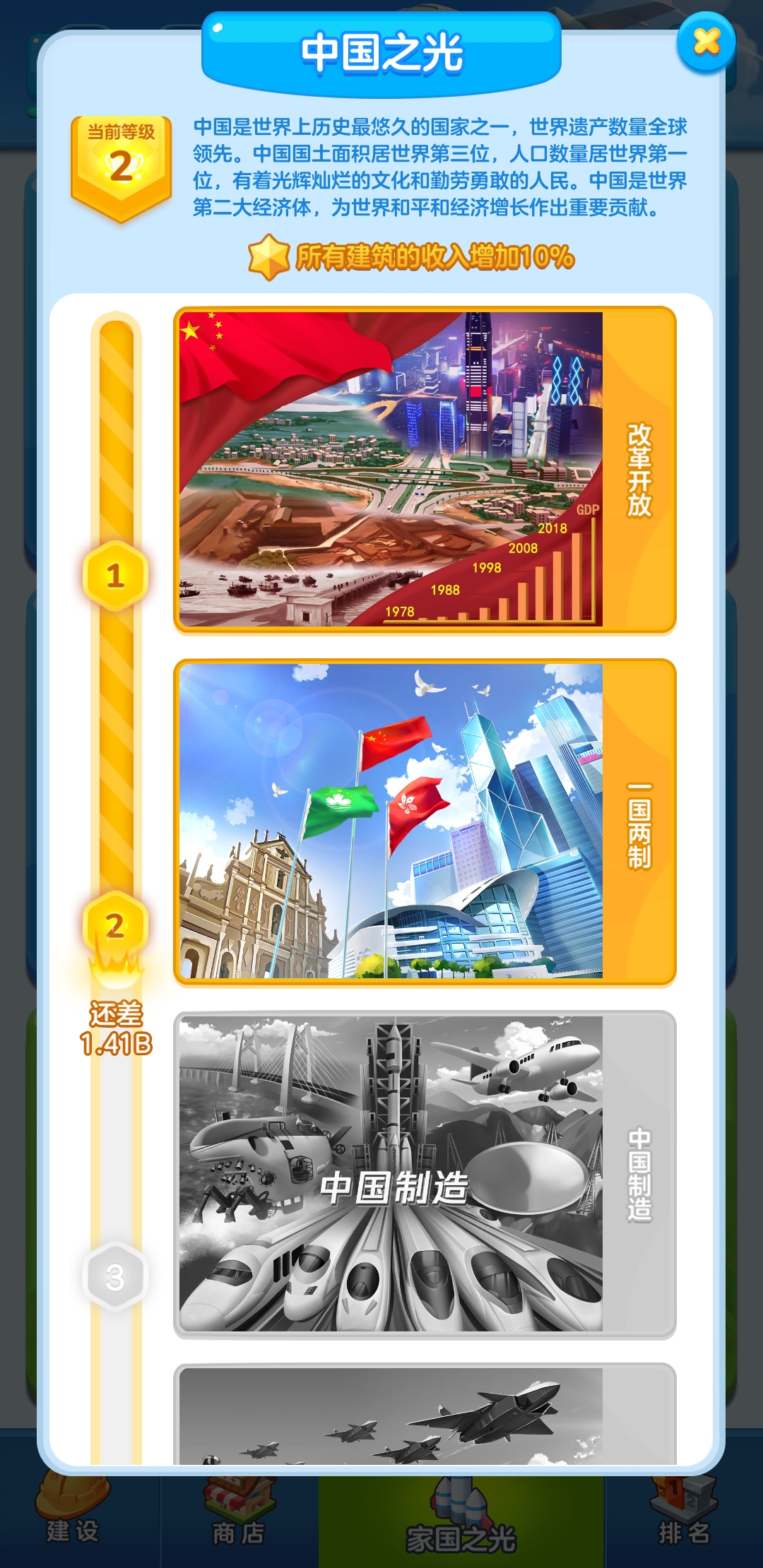 每一名建設者發展自己的城市,將會為自己的家鄉做出貢獻。當一個省的建設者們的貢獻達到一定的程度,一個家鄉之光就會解鎖。當一個新的家鄉之光解鎖後,本地區的收入將會增加,經濟發展將會上升一大級台階。